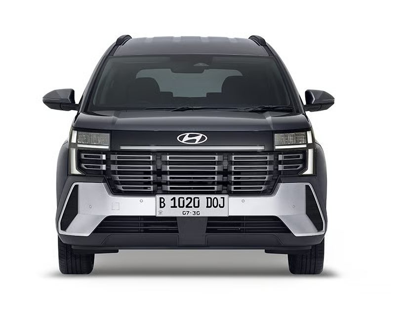 Hyundai Stargazer Cartenz tampil lebih gagah dan modern dengan fascia depan ala Palisade/Creta terbaru: bonnet lebih panjang, grille besar, dan lampu utama disematkan lebih tinggi.